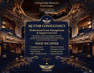 MJ Star Consultancy is a professional event management and support services company based in Bengaluru. We specialize in planning, organizing, and managing a wide range of events with precision, professionalism, and reliability. Our goal is to deliver well-organized events that create memorable experiences for our clients and their guests.