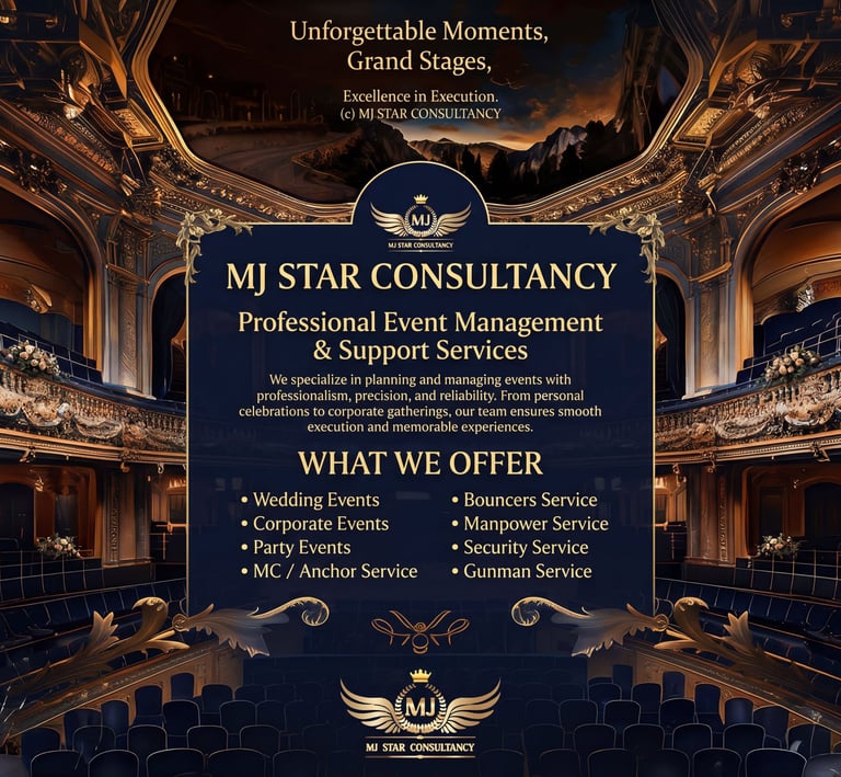 At MJ Star Consultancy, we focus on quality service, disciplined execution, and customer satisfaction. Whether it is a personal celebration or a professional corporate event, we strive to provide dependable solutions that ensure your event runs smoothly and successfully.